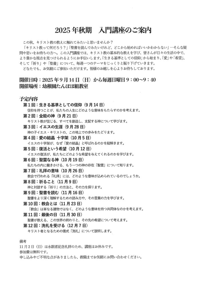 2025年秋期入門講座 2025年9月12日 2025年9月12日 9月14日から全12回、毎日曜日9時から実施します。 詳細は[続きを読む]をクリック。教会が初めての方も参加できます。 お問い合わせ先:03-3583-0403